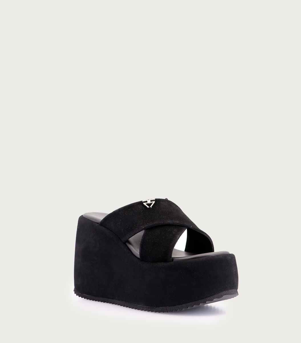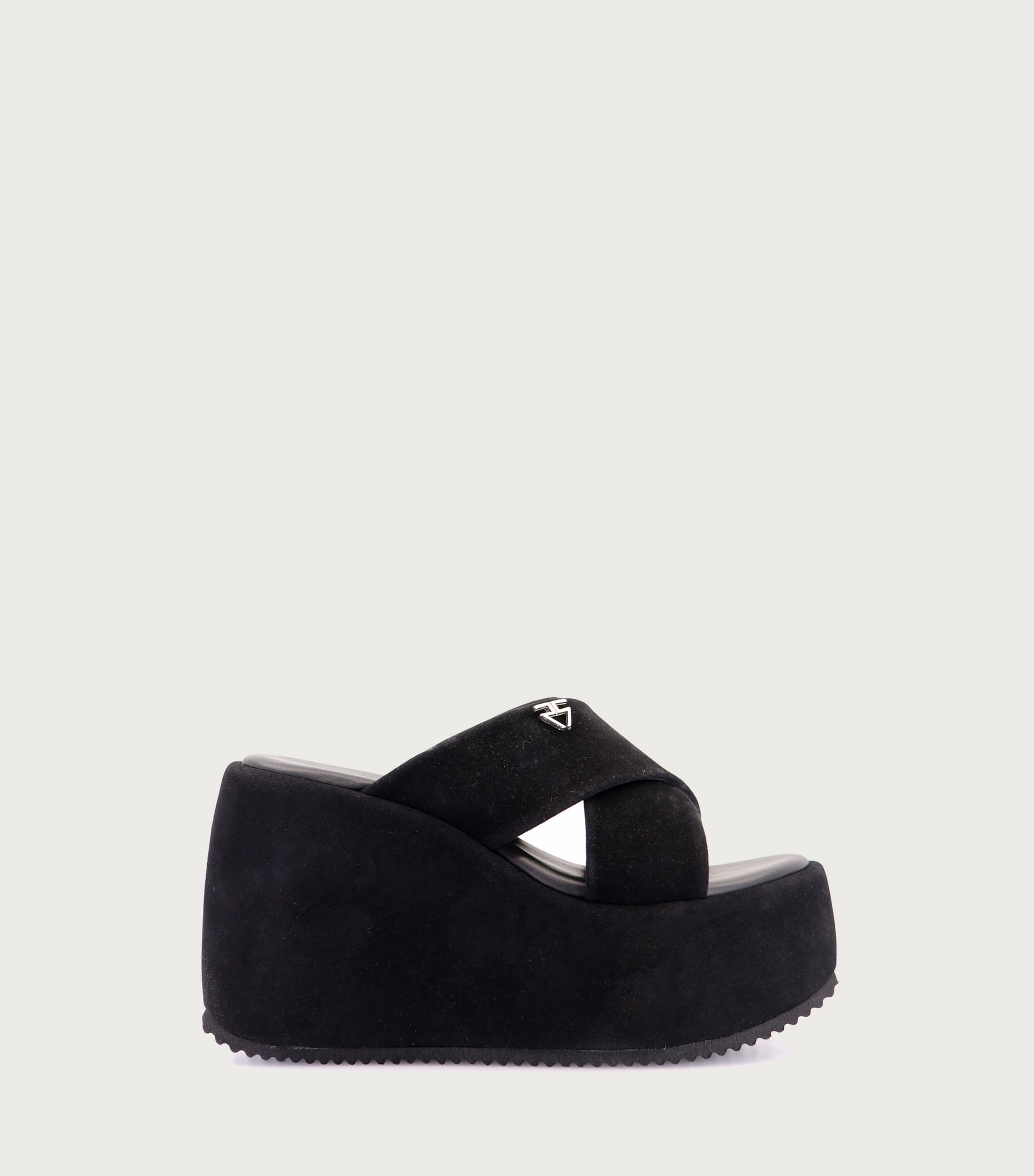 Plataforma Bink negra, en microfibra con capellada cruzada. Forrada en el mismo material para un acabado uniforme. Altura de plataforma: 11 cm. Una alternativa delicada y actual.