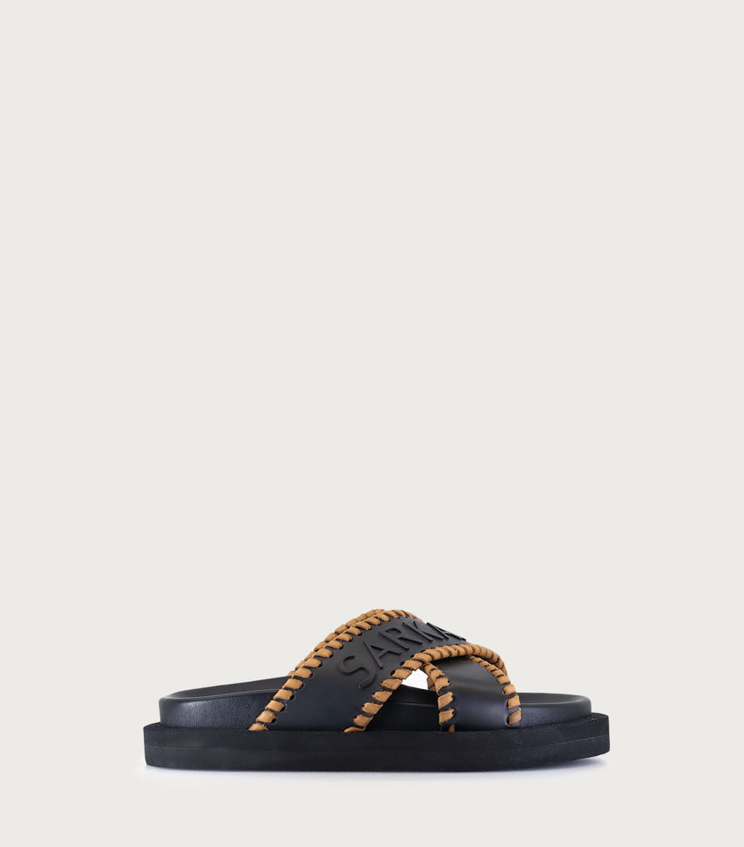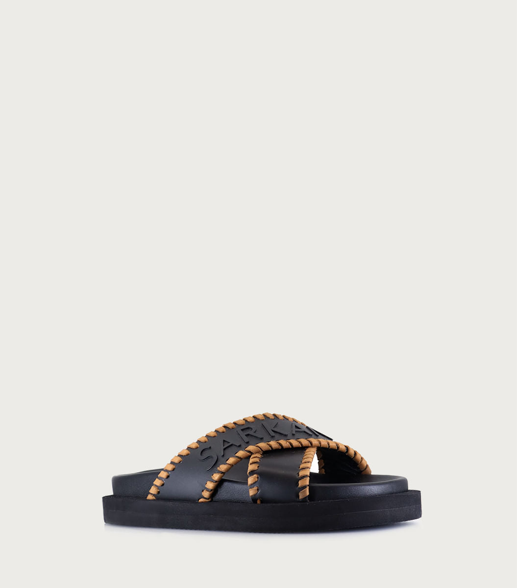 Plataforma Heli negra de tiras cruzadas: una en goma con logo SARKANY y otra en fibras animal friendly. Forro en fibras animal friendly. Plantilla Birk y suela a tono.