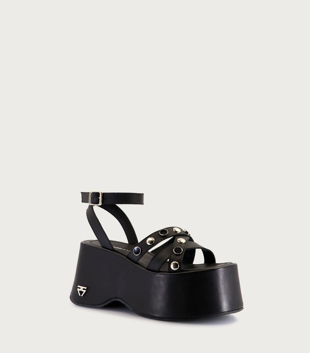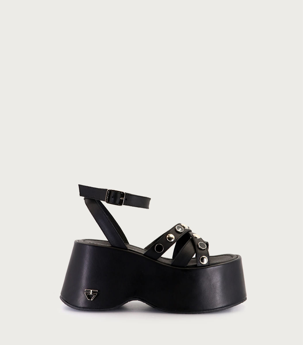 Plataforma Nagi negra. Confeccionada en cuero vacuno, presenta tiras con herrajes y pulsera que realzan su carácter. La forrera en fibras animal friendly aporta suavidad y confort. Su base forrada en cuero de 9 cm ofrece altura y seguridad. Un estilo moderno y versátil.