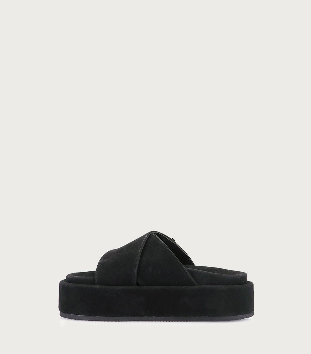 Plataforma Nox negra, en rafia con capellada cruzada y aplique Sarkany. Forrera en fibras animal friendly. Base forrada en el mismo material de la capellada. Altura de plataforma: 4,5 cm. Su diseño atemporal garantiza elegancia y confort en todo momento.