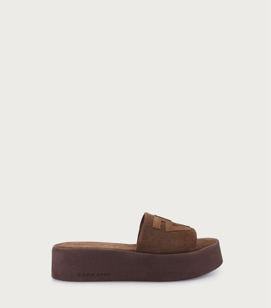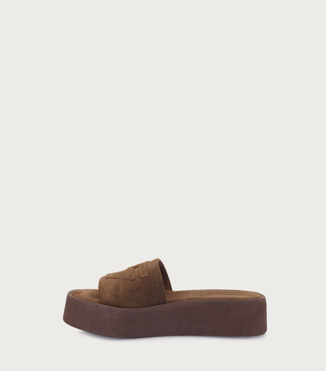 Plataforma Viper Chocolate, confeccionada en faja de gamuza con logo en el mismo material. Posee forrería de cuero vacuno y plataforma de goma EVA de 4 cm. Perfecta para un look sofisticado.
