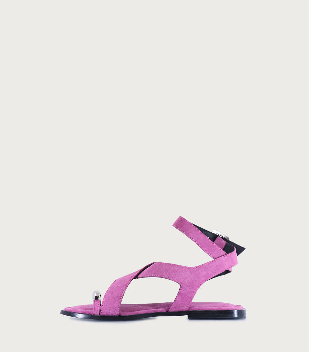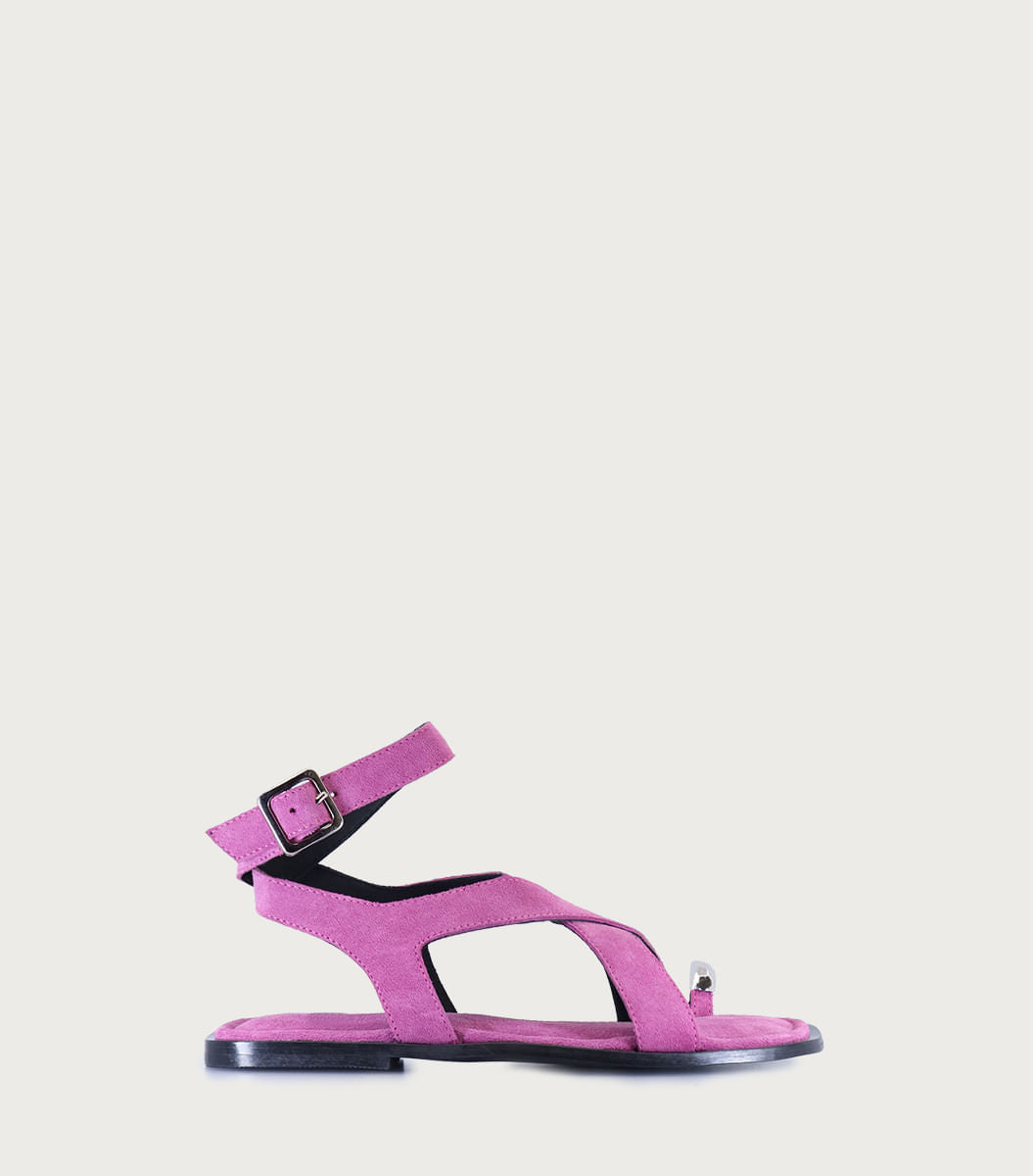 Sandalia Dali violeta, de cuero gamuzón con aplique facetado de metal en el dedo. Plantilla acolchada con efecto confort y suela de goma artesanal.