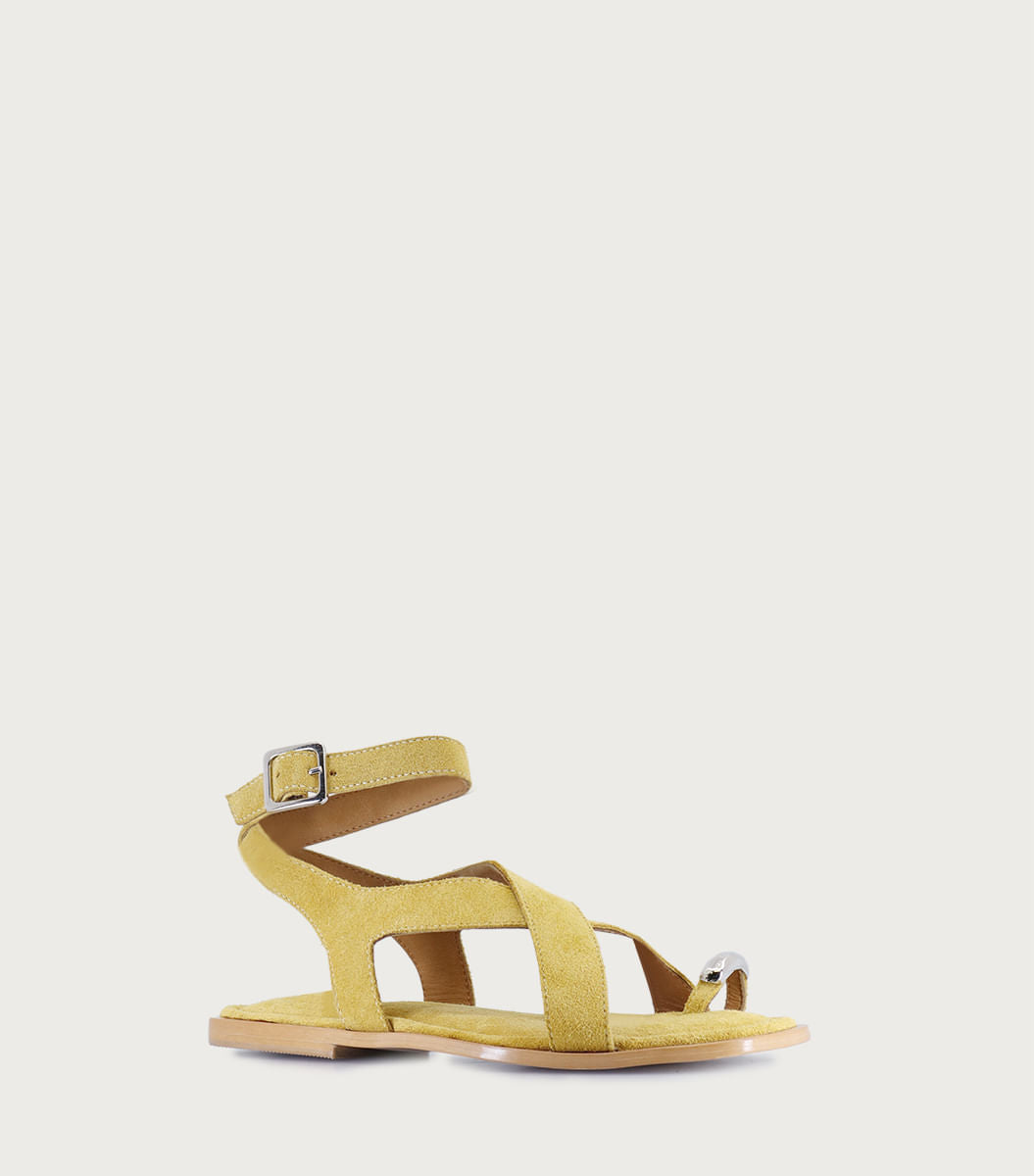 Sandalia Dali amarilla, de cuero gamuzón con aplique facetado de metal en el dedo. Plantilla acolchada con efecto confort y suela de goma artesanal.