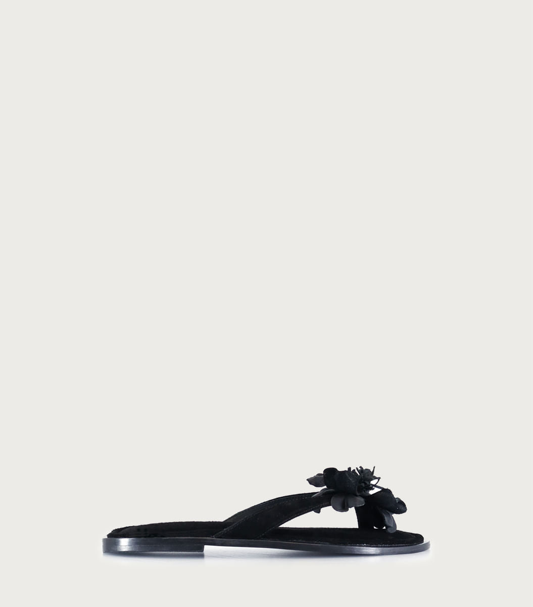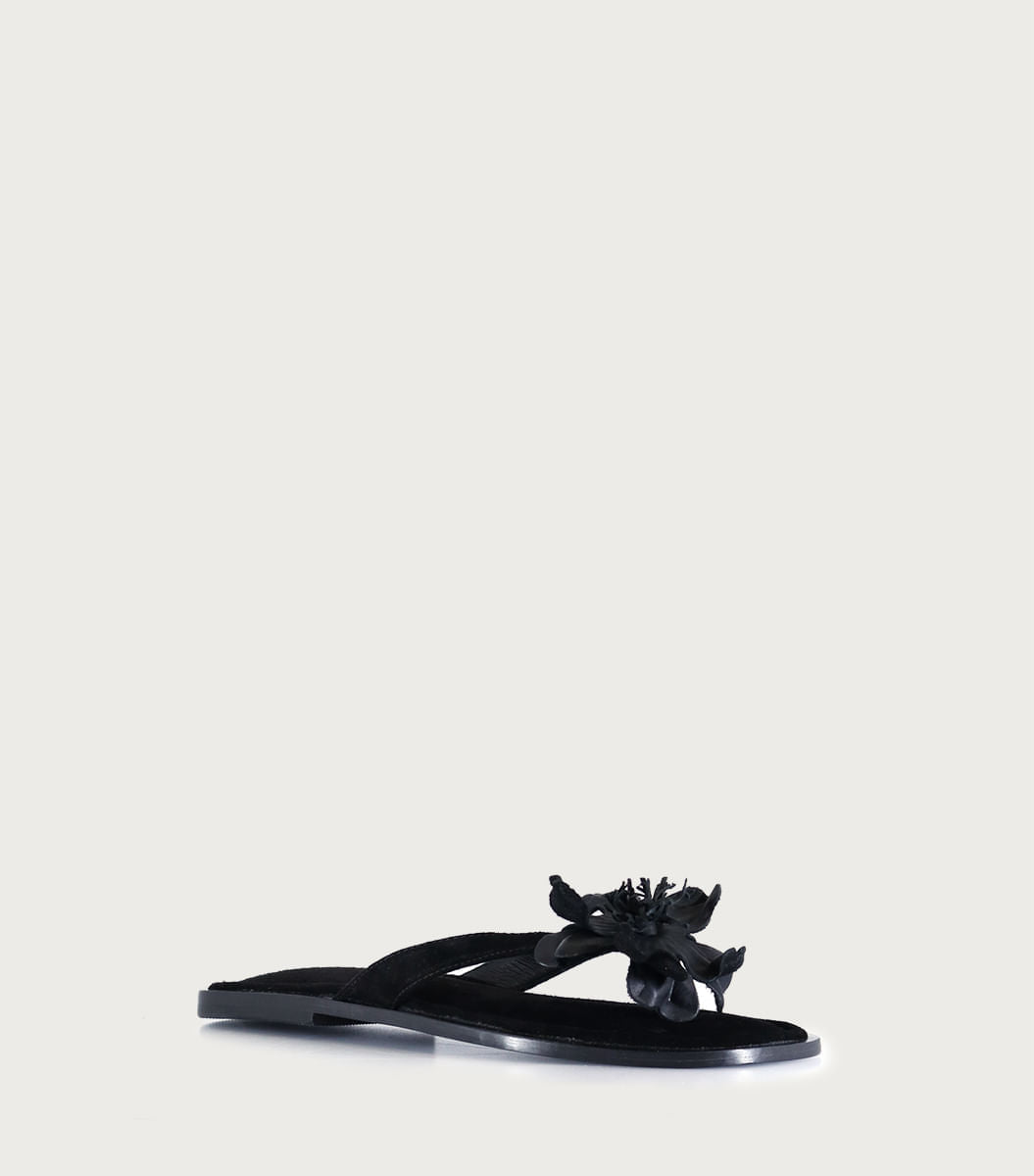 Ojota Era negra, de cuero gamuzón con aplique central en forma de flor del mismo material. Forro de cuero vacuno, plantilla acolchada con efecto confort y suela de goma artesanal.
