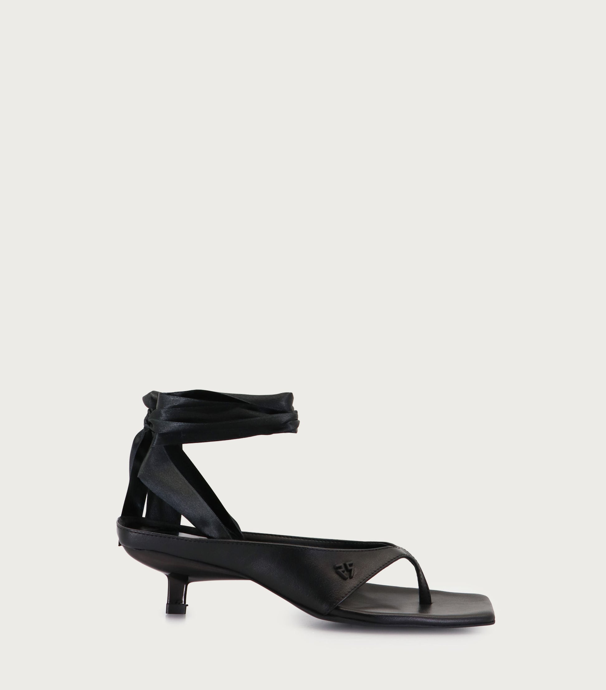 Ojota Maha negra, de fibras animal friendly con tira gitana desmontable y logo RS en la capellada. Plantilla y talón cuadrado, taco pintado de 3,5 cm y suela de cuero flexible. Ideal para un estilo casual y versátil.