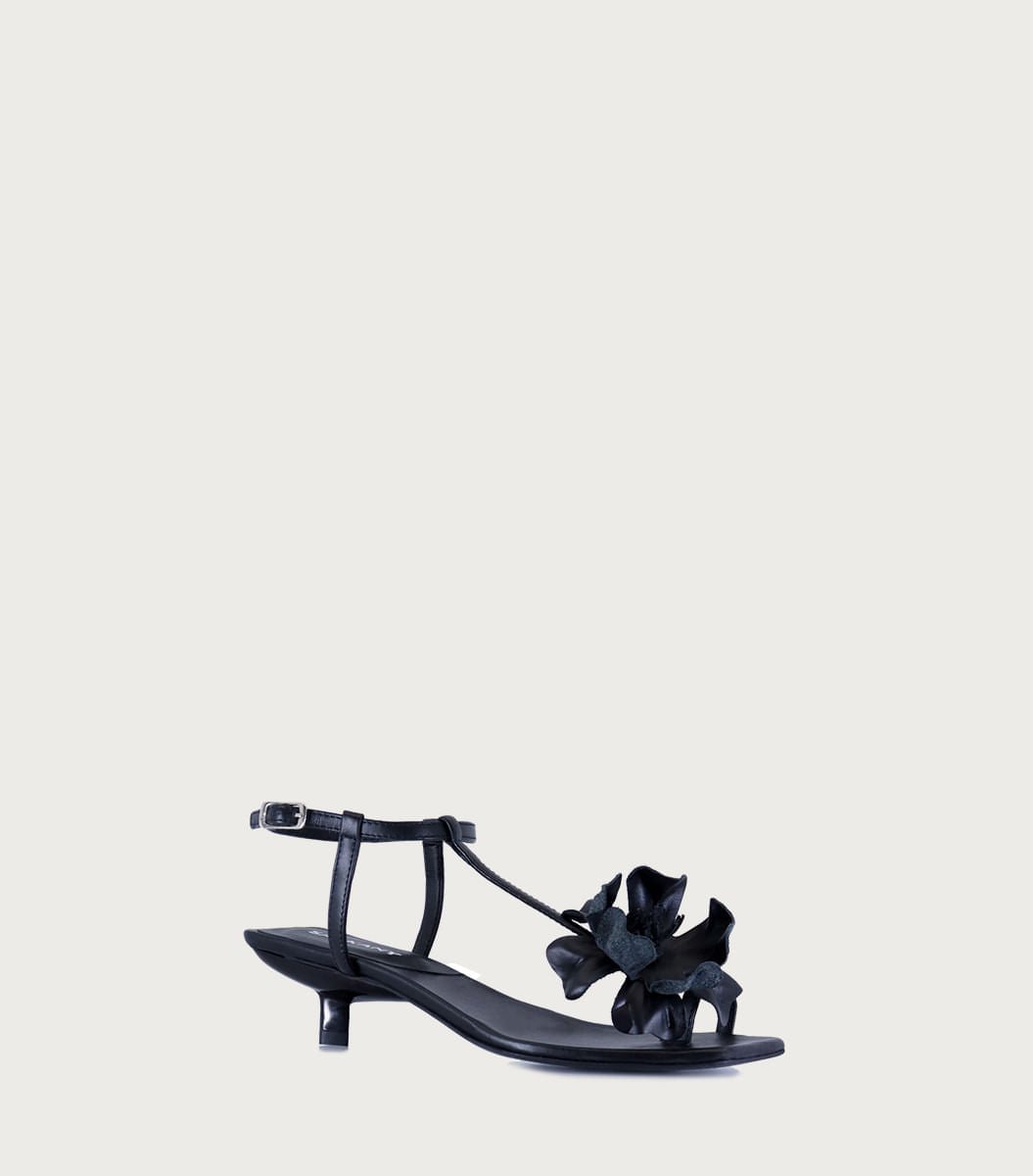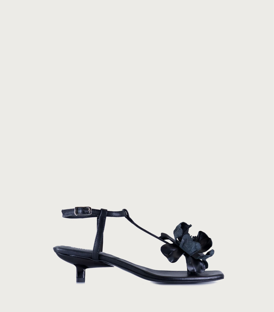 Sandalia Miho negra, de fibras animal friendly con diseño de dedo y detalle de flor en la tira del empeine. Pulsera con hebilla, plantilla y talón cuadrado, taco pintado de 3,5 cm y suela de cuero flexible. Perfecta para un look femenino y cómodo.