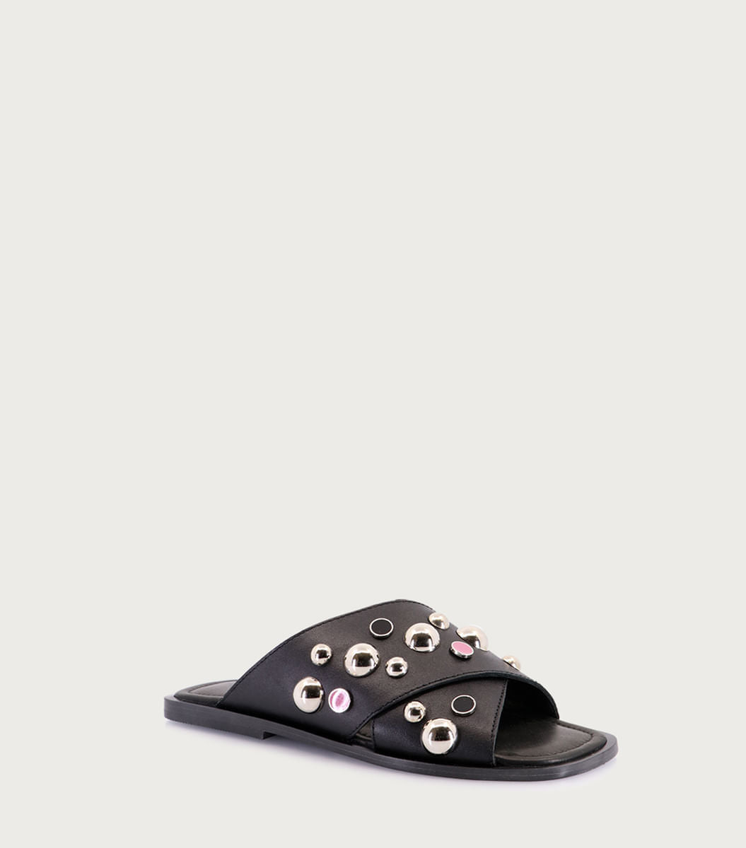 Sandalia Zaba negra, con tiras cruzadas de cuero y aplique de diferentes tachas esféricas y esmaltadas. Forro de cuero vacuno. Plantilla acolchada con efecto confort y suela de goma artesanal.